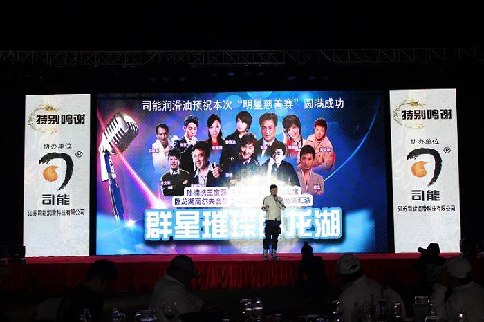 ? ? ? ?2014年12月15日晚,柳州臥龍湖高爾夫俱樂部隆重舉辦開業(yè)周年慶典暨會員“明星慈善邀請賽”,孫楠、王寶強(qiáng)、朱時茂等十幾位明星齊聚柳州臥龍湖。高爾夫賽事、慈善晚宴、文藝匯演,司能潤滑油作為協(xié)辦單位傾情傾力,與群星共同呈現(xiàn)了一場璀璨搖曳的視聽饕餮盛宴。