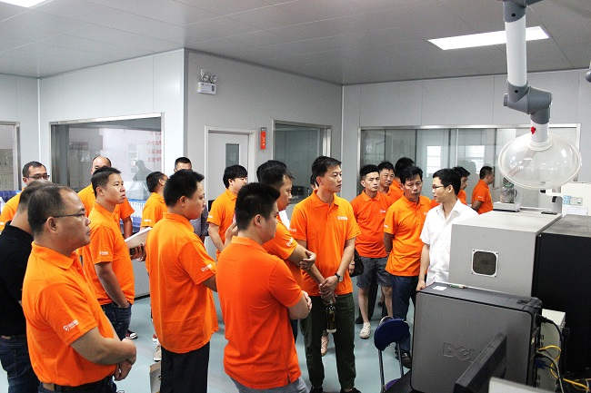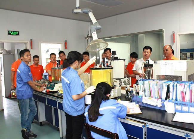 研發(fā)中心主任韋起桂帶領(lǐng)大家參觀了司能的中心實(shí)驗(yàn)室。該中心目前是廣西壯族自治區(qū)內(nèi)技術(shù)水平最高、分析手段最齊全的潤(rùn)滑油分析評(píng)定中心。韋主任針對(duì)生產(chǎn)自動(dòng)化,基礎(chǔ)油采購(gòu)渠道,先進(jìn)的技術(shù)檢驗(yàn)研發(fā)設(shè)備等話題與現(xiàn)場(chǎng)來賓們進(jìn)行了交流與探討,使之更加拉近與經(jīng)銷商、終端客戶的距離。